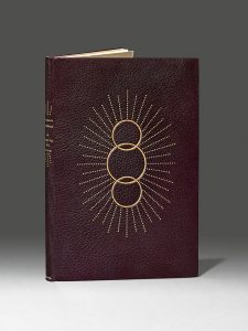 Édition originale. # Ce recueil de poèmes composés à Riom, en prison, forme le deuxième Cahier des Trois anneaux, après Antigone Vierge-Mère de l’Ordre publié en 1948. # Un des 75 exemplaires de tête sur marais à la cuve d'un tirage total à 575 exemplaires numérotés. # Séduisante reliure allusive de Madeleine Gras aux trois anneaux rayonnants. # D'abord relieur amateur, Madeleine Gras (1891-1958) exposa au salon de la Société nationale des Beaux-Arts en 1922, puis à l'Exposition des Artistes décorateurs en 1928 et les années suivantes. Artisan professionnel à partir de 1942, elle exerça jusqu'en 1958. Après l'École des Arts décoratifs, elle passa quelques années dans l'atelier d'Henri Noulhac et commença à travailler pour différents collectionneurs, dont les David-Weil. # « Moderne sans exagération ni cubisme, ses efforts tentent à s’affranchir des influences extérieures, notamment de celle de Pierre Legrain, et à se créer une personnalité propre » (Crauzat). # « Née dans un milieu artiste, elle marie avec une grande finesse les matières et les couleurs, ne se départissant jamais d’une sobriété qui marquera les époques à venir… Elle se fait plus classique après la Seconde Guerre mondiale, mais reste toujours élégante et inventive » (Yves Peyré). # « Après la guerre, écrit Julien Fléty, ses thèmes de décor, exécutés par des doreurs tels que J. Fache, allient à l'inspiration la plus heureuse la perfection technique de l'exécution. » # Bel exemplaire, au dos légèrement éclairci néanmoins. # Crauzat, II, 160-161 – Devauchelle, III, 260-261 – Fléty, 84 – Peyré, 188.