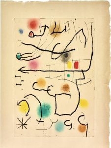 Édition originale de superbe ouvrage d'iliazd publié, à la demande de la Bibliothèque nationale, en hommage au célèbre graveur parisien Rogelio Lacourière, qui travailla pour les plus grands peintres illustrateurs de livres. # Le beau texte poétique d'Iliazd est précédé d'un texte de Pablo Picasso, également en édition originale, commençant par les mots Aux quatre coins de la pièce... # L'édition est ornée de treize gravures originales à l'eau-forte ou à la pointe-sèche à pleine page, dont trois en couleurs d'André Beaudin, Max Ernst et Joan Miró et dix en noir de Camille Bryen, André Derain, André Dunoyer de Segonzac, Alberto Giacometti, Alberto Magnelli, Louis Marcoussis, André Masson, Jules Pascin, Pablo Picasso et Léopold Survage. # Tirage à 75 exemplaires numérotés, celui-ci un des 15 exemplaires « de compagnons » sur vieux japon (n°x), signé par Iliazd à la justification, mais aussi par tous les artistes – hormis Derain, Giacometti, Pascin et Marcoussis, décédés avant la parution du livre – au crayon noir ou de couleur sur une double page de l'ouvrage. # Le volume est en outre enrichi d'une lettre d'Iliazd relative à la publication du livre, montée sur une garde. # Magnifique exemplaire dans une magistrale reliure lettriste de Pierre-Lucien Martin. # Elle est très proche de celle qu'il a exécuté sur l'exemplaire du même ouvrage de la collection Paricaud (vente I à Paris, [21 novembre 1996], lot 135, ill.) qui figurait dans l'exposition Picasso, les poètes et la reliure (Paris, Maison de la poésie, 1991, n°82, ill.). Remarquons toutefois que, sur notre exemplaire, le décor lettriste est apposé de façon plus imaginative, et peut-être plus subtile, les noms des treize artistes ayant été disposés de manière à se chevaucher sur les bandes horizontales. # De la bibliothèque José Luis et Beatriz Plaza (ex-libris, vente à Londres, 27 juin 1997, lot 53, ill.). # Monod, n°6251 – Chapon, Le Peintre et le Livre, p. 296 – Bloch, 1243 – Cramer : Picasso, 141 – Cramer : Masson, 77 – Cramer : Miró, 120.