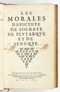 [DESMARETS DE SAINT-SORLIN (J.)]. Les Morales d’Épictète, de Socrate, de Plutarque et de Sénèque. Au chasteau de Richelieu, De l’imprimerie d’Estienne Migon, 1653, maroquin aubergine, sur les plats, jeu de filets et de roulettes dorés en...