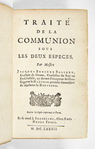 BOSSUET (J.-B.). Traité de la communion sous les deux espèces. Bruxelles, Eug.-Henry Fricx, 1682, petit in-12, vélin rigide crème, dos lisse, tranches lisses (reliure ancienne).
