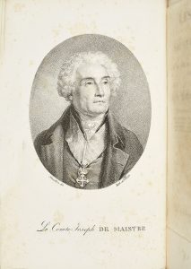 ÉDITION ORIGINALE posthume de l’ouvrage majeur de Joseph de Maistre (1753-1821). Il est précédé d’une préface de Jacques Bins de Saint-Victor et suivi d’un Éclaircissement sur les sacrifices. Homme politique, philosophe et diplomate savoisien, Joseph de Maistre fut, en 1802, envoyé par le roi de Savoie, Victor-Emmanuel Ier, comme ministre plénipotentiaire à Saint-Pétersbourg. Très lié aux princes Galitzine, il devint le proche conseiller du tsar Alexandre Ier (1777-1825). Les Soirées de Saint-Pétersbourg se présentent comme une suite de onze entretiens avec deux interlocuteurs, l’un français et l’autre russe. Maistre y expose les fondements de ses conceptions politiques, essentiellement monarchiques et théocratiques. Il est, avec le vicomte de Bonald (1754-1840), l’un des principaux théoriciens de la pensée contre-révolutionnaire. Un portrait de l’auteur lithographié par Villain d’après Bouillon. Il manque souvent. Relié à l’époque, l’exemplaire présente quelques habituels petits défauts, discrètes rousseurs, petites mouillures en marges du t. I. Dimensions : 210 x 134 mm. Provenances : Ant. Wolski, avec son ex-libris ; mention manuscrite à l’encre rouge sur l’un des feuillets de garde du tome premier « Bibl. de Mr Gourau (?) » ; Alfred Clériceau, avec son ex-libris.