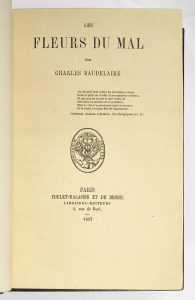 ÉDITION ORIGINALE de ce recueil dédié à Théophile Gautier. Peinture d’un paysage intérieur complexe et changeant, Les Fleurs du mal sont l’expression d’une quête à la fois formelle, spirituelle et sensorielle. Charles Baudelaire (1821-1867) y invente de nouvelles images reposant en particulier sur l’idée d’une correspondance entre les sens. Pour publier son recueil, le poète s’était adressé à Auguste Poulet-Malassis (1825-1878), qui avait déjà édité Leconte de Lisle, Banville, Gautier… Le volume parut en juin 1857, après plusieurs mois de corrections. Le procès qui advint très vite après sa sortie imposa la suppression de six poèmes. L’éditeur fut alors contraint de supprimer ces pièces condamnées de bon nombre des quelque 1 100 exemplaires qu’il avait été prévu d’imprimer. Exemplaire non expurgé et présentant l’essentiel des remarques de première émission, telles que les décrit Launay. Reliure doublée vraisemblablement réalisée par Adolphe Cuzin, fils de Francisque Cuzin. Celui-ci, installé à Paris en 1861, avait exercé jusqu’à sa mort en 1890. L’atelier était alors passé à son fils, Adolphe, qui en 1892 l’avait cédé au premier ouvrier de son père, Émile Mercier. Après quoi, il avait travaillé dans divers ateliers de confrères avant, en 1901, de rouvrir une nouvelle officine à son nom, rue Dauphine. Dimensions : 190 x 121 mm. Aucune marque de provenance. Carteret, I, pp. 118-123 ; Talvart et Place, I, p. 284, n° 9 A ; Vicaire, I, 341-343 ; Launay (J.-J.), « Impressions, publications, écrits d’Auguste Poulet-Malassis… », in Bulletin du bibliophile, 1979, IV, pp. 523-526, n° 26 ; Oberlé (G.), Poulet-Malassis, Montigny-sur-Canne, Le Manoir du Pron, 1996, pp. 86-87, n° 212 ; Pichois (Cl.) – Avice (J.-P.), Dictionnaire Baudelaire, pp. 189-190 ; Devauchelle (R.), La Reliure en France, III, …de 1850 à 1899, pp. 62-66 ; Fléty, pp. 50-51.