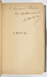 ÉDITION ORIGINALE de ce recueil poétique dédié à son fils Georges. Deuxième volet de son polyptique chrétien. Composé en 1887, l’ouvrage fut publié en mars 1888. Comme souvent, Verlaine (1844-1896) y adjoignit quelques pièces écrites dès 1875 qui étaient restées à l’écart des recueils précédents. À sa parution, Théodore de Banville le célébra : « Vous avez fait un prodige... vous avez grandi sans cesse. » Avec Sagesse (1881) et Bonheur (1891), il forme un triptyque voué à l’amour divin. Précieux exemplaire offert par l’auteur au compositeur Emmanuel Chabrier, avec cet amical envoi : à Emmanuel Chabrier Bien affectueusement P. Verlaine Emmanuel Chabrier (1841-1894), auteur de nombreux opéras, pièces pour piano et chansons, rencontra certainement Verlaine chez la marquise de Ricard, puis chez Nina de Villars. Le compositeur se servit, pour sa partition de L’Étoile, d’un scénario d’opérette donné par Verlaine et les paroles de La Chanson du Pal passent pour être aussi l’œuvre de celui-ci. Dans Amour, le poète lui dédie un poème-hommage, À Emmanuel Chabrier (pp. 87-88) : « Chabrier, nous faisions, un ami cher et moi / Des paroles pour vous qui leur donniez des ailes, / Et tous trois frémissions quand, pour bénir nos zèles, / Passaient l’Ecce deus et le Je ne sais quoi. […] ». Il sera repris dans Dédicaces, en 1890. L’exemplaire a été relié avec soin par Émile et André Maylander. Dimensions : 179 x 114 mm. Provenances : Emmanuel Chabrier ; Daniel Sicklès (Cat. II, 28-29 novembre 1989, n° 536). Vicaire, VII, 994 ; Montel (Fr.), Bibliographie des œuvres de Verlaine, H. Leclerc, 1924, pp. 42-46 ; Galantaris (Chr.), Verlaine, Rimbaud, Mallarmé, Collection Édouard-Henri Fischer, Paris & Genève, 2014, pp. 145-148 et 173, nos 108-109 ; Buisine (A.), Verlaine. Histoire d’un corps, Tallandier, 1995, pp. 78, 106, 122 et 139 ; Fléty, p. 125.