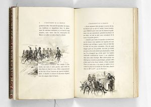 EXEMPLAIRE UNIQUE imprimé sur vélin spécialement pour le bibliophile Paul Reveilhac. Cette courte nouvelle dont Prosper Mérimée (1803-1870) place l’intrigue pendant les guerres impériales avait paru pour la première fois en 1829 dans La Revue française avant d’être incluse dans Mosaïque, recueil de nouvelles publié en 1833. 15 dessins originaux (un frontispice et 14 vignettes dans le texte (dont un petit portrait de Mérimée jeune à la fin de la préface)) représentant des sujets militaires spécialement composés à l’encre de Chine pour cet exemplaire par Alphonse Lalauze, certains étant rehaussés de lavis. Fils du graveur Adolphe Lalauze, Alphonse Lalauze (1872-1936) fut l’élève du peintre Édouard Detaille, dont les scènes militaires avaient fait la renommée. Il illustra des textes à caractère historique du duc d’Aumale, de Balzac ou encore du duc de Broglie… Le texte est précédé d’une préface signée P[aul] R[eveilhac], adressée au jeune illustrateur. Sont joints à la fin du volume : - l’esquisse du frontispice et 4 dessins à la plume rehaussés de lavis d’encre de Chine ; - un dessin à l’encre de Chine ; - 7 esquisses à la mine de plomb reprises au lavis d’encre ; - 3 dessins à la plume rehaussés de couleurs à l’aquarelle. Tous les dessins aboutis sont signés ou monogrammés et datés 1891 ou 1892. Charmant exemplaire dans une reliure réalisée par Marius Michel à la demande du commanditaire de cette édition. Le volume est conservé dans un étui bordé de maroquin tabac. Dimensions : 244 x 170 mm. Provenances : Paul Reveilhac ; Pierre Reveilhac, avec son ex-libris à sa devise : « Nunc et semper ». Osterwalder (M.), Dictionnaire des illustrateurs, 1890-1945, Neuchâtel, Ides et Calendes, 1992, p. 652 ; Vicaire, V, 710 (pour l’édition originale de 1833) et 752 (pour une édition illustrée par Maurice Orange (Rouquette, 1894)) ; Pierre Reveilhac, Petit Voyage autour de ma bibliothèque, La Croix-Richard, 1940-1947, pp. 143-144 (« [Alphonse Lalauze] interprète Mérimée à la perfection, surtout dans ses cavaliers, qui ne le cèdent en rien à ceux de Detaille »).