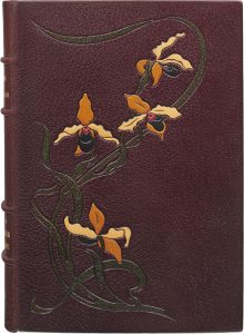 POE (Ed.) – BAUDELAIRE (Ch.) – LEGRAND (L.). Quinze histoires d’Edgar Poë. Paris, Imprimé pour Les Amis des livres par Chamerot et Renouard, 1897, in-4°, maroquin aubergine orné sur le premier plat d’une branche d’orchidée Art nouveau...