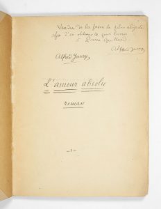 JARRY (A.). L’Amour absolu. Roman. S. l., s. n., s. d. [Paris, 1899], in-12°, broché, couverture bulle muette.