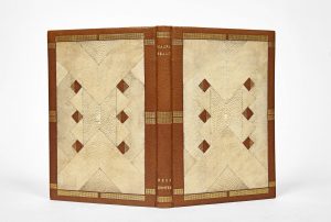 couleur avec jeux de pointillés or s’opposant, bordure intérieure de même peau selon le même décor, doublure et gardes de daim havane, couverture et dos, non rogné, étui gainé de même peau (Pierre Legrain – J.-A.-L.).