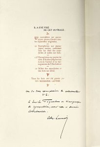 Recueil de contes extraits de l’œuvre de Hans Christian Andersen (1805-1875), dont La Petite Sirène et Le Compagnon de voyage. Texte imprimé en noir et en couleurs. 52 eaux-fortes, dont 11 hors-texte, par A. Lunois, et 60 dessins par le même, interprétés sur bois par Suzanne Lepère et tirés en couleurs. Peintre, graveur et lithographe, Alexandre Lunois (1863-1916) fit un long voyage qui le mena de Scandinavie au Maroc, en passant par l’Espagne, pays dont les lumières et les motifs inspirèrent profondément son œuvre. Éditeur de ce volume, il put multiplier librement les expériences d’impression qu’il aurait été difficile de réaliser autrement, et qui servent brillamment la féerie des contes d’Andersen. L’un des 2 exemplaires de collaborateur, non annoncés ; celui-ci, sur papier de cuve d’Arches. Il est justifié à la main (n° 2) et accompagné d’un envoi autographe d’Alexandre Lunois au compositeur-pressier qui imprima l’ouvrage : À Émile Féquet (sic), En témoignage de sympathie, pour sa si dévouée collaboration. Alex. Lunois L’exemplaire, relié par René Kiefer, comporte en outre : - sur le feuillet qui précède la préface, un dessin rehaussé à l’aquarelle dédicacé et signé au crayon par l’artiste ; - une suite des bois tirée en noir sur chine mince. Typographe-imprimeur d’art, Émile Fequet fut jusqu’en 1907 le collaborateur d’Auguste Lepère. Il travailla ensuite, entre autres, pour Ambroise Vollard. Sa fille, Marthe, lui succéda et s’associa avec Pierre Baudier pour créer l’imprimerie d’art Fequet et Baudier, où Rouault, Picasso, Matisse, Braque, Miró, de Staël ou Arp… firent régulièrement tirer leurs estampes. D’abord doreur chez Chambolle-Duru, René Kiefer (1875-1963) ouvrit son propre atelier de reliure en 1910 et exerça jusqu’en 1958. Il fut l’un des relieurs des débuts de Pierre Legrain (1889-1929). Tirage limité à 146 exemplaires, auxquels s’ajoutent les 2 exemplaires de collaborateur. Dimensions : 265 x 171 mm. Provenances : Émile Fequet ; Géo Valdelièvre, avec son ex-libris gravé sur bois par Perrichon d’après Pierre Fritel.