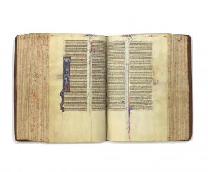 (Rel. du début du xviie) sous chemise et emboîtage mod. maroquin noir. Texte en latin sur deux colonnes à 42 lignes. L’illustration consiste de 129 initiales historiées ou enluminées donnant divers saints personnages, le reste avec initiales en bleu ou rouge. Cette très élégante illustration est typique des Bibles ou Psautiers de l’époque. Un peu court de la marge supérieure. Reliure usagée et restaurée.
