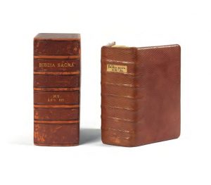 Bibla sacra, de la seconde moitié du xiiie siècle (vers 1270). manuscrit sur peau de vélin de 639 ff., avec plusieurs initiales peintes de diverses couleurs, certaines avec personnages, relié en un fort vol. in-12, chag. moderne sur ais de bois,