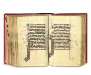 froid, tr. dor. et peintes de fleurs sous emboîtage mod. demi-rel. chag. rouge. Texte en latin sur 18 lignes, émaillé de très nombreuses initiales en or vif sur fonds de différentes teintes. La principale décoration consiste en 10 grandes initiales avec diverses scènes peintes en bleu ou rose sur fond d’or vif, d’une iconographie peu commune. 1. Dialogue entre Dieu et David. 2. Dieu apparaissant à David sur un nuage.David armé d’un glaive et évêque. 4. David et un pauvre. 5. Dieu et David. 6. David au carillon. 7. Sainte Messe. 8. Prière au mont des Oliviers. 9. Crucifixion. 10. Grandes Initiales ornées surmontées d’un évêque bénissant la donatrice. Le début du texte semble manquer, une pagination dans le bas commençant à 14. 2 feuillets courts de marge. Provenance : ancienne collection Carlo de Poorter.