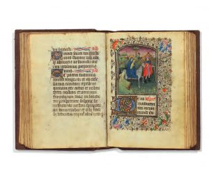 Heures. Flandres, vers 1420. Par le Maître aux Rinceaux d’or. manuscrit sur peau de vélin de 133 ff. avec 14 miniatures, rel. en un vol. gd. in-8, veau fauve du xixe siècle avec plats du xvie siècle remontés sur ais de bois, présentant un décor
