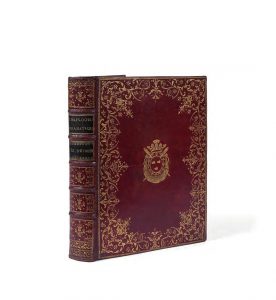 Dauphine. aparis, de l’imprimerie de Grangé, 1773, in-4, maroquin rouge, large dentelle dorée aux petits fers sur les plats, armes dorées frappées au centre, dos à nerfs, orné de fleurons dorés, dent. int. dor., doublés et gardes de soie bleue, tr. dor. (Rel. de l’époque). Edition Originale illustrée de 3 figures, 15 en-têtes et 10 culs-de-lampe dessinés par Eisen et gravés par N. de Launay, Helman, Masquelier, Née et Ponce. Ce volume, le seul paru, contient : Sophonisbe, de Du Ryer, Scévole, de Mairet et Venceslas, de Rotrou. Bel exemplaire dans une riche reliure à dentelles, aux armes de Armand-Thomas Hue de Miromesnil (1723-1796). Il fut d’abord reçu conseiller au Grand Conseil en 1745 et premier président du Parlement de Rouen en 1757. Maurepas, dont il était l’ami, le fit nommer garde des sceaux en 1774. (Olivier pl. 2311). Reliure restaurée. Provenance : ex-libris Henri Béraldi. Ii. N°172 - ex-Musaeo Hans Fürstenberg.