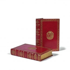 vol. in-8, maroquin rouge, large dentelle dor. encadrant les plats, armes dorées frappées au centre, dos orné de large fleurons dor., garde de moire verte, tr. dor. (Rel. de l’époque). Qq. frottements éparses sur les plats. Petite note manuscrite sur la garde mentionnant la provenance «De la bibliothèque de Rosny, Paris, 20 février au 22 mars 1837, page 126». Exemplaire aux armes de Marie-Caroline de Bourbon-Sicile, duchesse de Berry (1798-1870). Ex-libris Bibliothèque de Rosny. (Olivier pl. 2554).