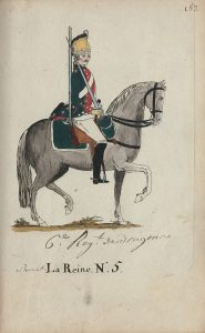 Costumes Militaires.— Uniformes Des Troupes De France d’après le règlement de 1779. Ce livre contient la Maison du Roy, l'infanterie françoise et étrangères, la cavalerie françoise et étrangère, les régimens de chevaux légers, les...