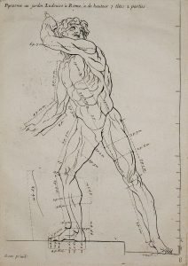 Abrégé d'anatomie accommodé aux arts de peinture et de sculpture. À Paris, chez Crépy, 1760. In-folio, [1] f. (titre gravé illustré), 4 p., [10] f. comportant 10 figures gravées sur cuivre à pleine page et le texte explicatif, broché, sans couverture (exemplaire très usagé, nbr. défauts, lacunes et réparations).