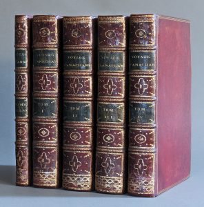 BARTHÉLÉMY (Jean-Jacques). Voyage du jeune Anacharsis en Grèce, dans le milieu du quatrième siècle avant l'ère vulgaire. À Paris, chez de Bure l'aîné, 1788. 5 volumes in-4, reliure de l'époque plein maroquin rouge, dos à nerfs orné,...