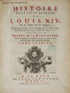 BRUZEN DE LA MARTINIERE (Antoine-Augustin de). Histoire de la vie et du règne de Louis XIV, roi de France & de Navarre… A La Haye, chez J. van Duren, 1740-1742. 5 volumes in-4, reliure post. plein vélin, dos lisse, titre doré, tranches...