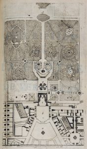 Nouvelle édition de l'ouvrage d'André Félibien paru en 1689 sous le titre " Recueil de descriptions & autres ouvrages… ". Elle renferme la description de l'arc de la place Dauphine, des Reines de Perse aux pieds d'Alexandre (peinture du cabinet du roi), et de deux tapisseries d'après Le Brun, les Quatre éléments et les Quatre saisons. La seconde partie du volume est consacrée à Versailles, avec les descriptions de fêtes, du château, du petit parc et de la grotte. illustré d'un plan du château et du petit parc gravé sur cuivre à pleine page, et légendé en regard.