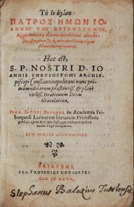 [BALUZE]. JEAN CHRYSOSTOME (saint). [Homélies]. Tu en hagiois Patros Emoon Ioannu Tu Chrysostomu…… logon [en grec]. Hoc est, S. P. Nostri D. Ioannis Chrysostomi… nunc primum editarum praestantiss. & planè utiliss. Orationum decas grecolatina....