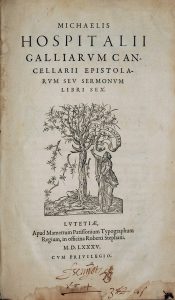 L'HOSPITAL (Michel de). Epistolarum seu sermonum libri sex. Lutetiae, in officina R. Stephani, 1585. In-folio, [2] f. (titre, dédicace à Henri III), 381 p., [1] f., bandeaux, lettrines, marque au titre, le tout gravé sur bois, reliure du XVIIe s.,...