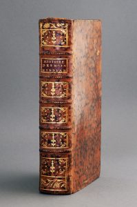 plein veau brun, dos à 5 nerfs, caissons finement ornés, pièces de titre et de tomaison maroquin grenat, roulette dorée aux coupes, tranches mouchetées rouges (accroc à un coiffe, plats épid., piqûres de vers en queue d'un dos).