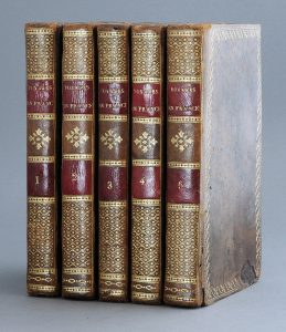 Voyages en France et autres pays. Orné de 36 planches. Tome I [-V]. Paris, Chaumerot, 1808. 5 vol. in-18, reliure de l'époque plein veau raciné, dentelle dorée encadrant les plats, dos lisse orné à la grotesque, pièces de titre et de tomaison...