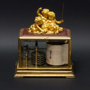 * BAROGRAPHE. Laiton doré, verre, marbre, métal doré. Breveté SGDG RF, Paris, entre 1880 et 1889. 24 × 19,5 × 13 cm. Très élégant barographe signé Boin-Taburet. Cet instrument était utilisé pour enregistrer la pression atmosphérique....