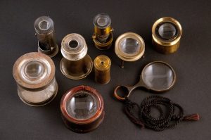 ENSEMBLE DE 8 LOUPES ET MICROSCOPES D'ENTOMOLOGISTE. Corne, laiton, étain. Dont un petit aquarium cylindrique pour observations d'insectes aquatiques.