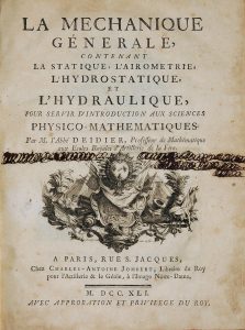 DEIDIER (abbé Nicolas). La Méchanique générale, contenant la statique, l'airométrie, l'hydrostatique et l'hydraulique pour servir d'Introduction aux sciences physico-mathématiques. À Paris, chez Charles-Antoine Jombert, 1741. 4 livres en 1...