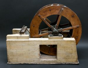 mues par dessous ; modèle dit de Poncelet. Le débit du cours d'eau se règle par une trappe montée sur une double crémaillère. Un modèle très proche de celui-ci, provenant de la collection de moteurs hydrauliques du Conservatoire National des Arts et Métiers, fut présenté à l'occasion de l'Exposition internationale de 1900 à Paris