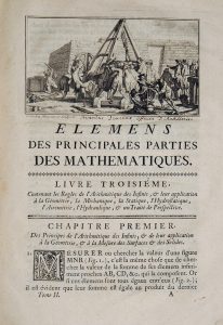 DEIDIER (abbé N.). Elemens généraux des principales parties des Mathématiques nécessaires à l'Artillerie et au Génie. Paris, Ch. A. Jombert, 1745. 2 vol. in-4, , T.I: (4), 590, (2)pp., 29 pl. ; T.II: (4), 376pp., 32 pl., 61 [sur 62] pl. dépl....