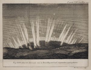 Dortous de Mairan attribue l'aurore boréale à une extension de l'atmosphère du soleil. " Son catalogue d'aurores lui permet, bien avant la découverte du cycle de l'activité solaire, de remarquer que les observations d'aurores montrent des "reprises" d'activité " (Lalande, Bibl. astronomique, p. 420).