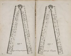 2 planches hors-texte gravées sur cuivre " Figure du Compas de proportion faite par Chapotot ", instrument ayant " pour objet de résoudre promtement & sans calcul les problèmes les plus ordinaires de la géométrie pratique ". Nouvelle édition corrigée et augmentée de cet ouvrage qui fut publié pour la première fois en 1688.