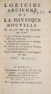 Édition originale du Père Noël REGNAULT (1683-1762), professeur de mathématique et de physique au collège Louis-le-Grand. Dans cet ouvrage, qui visait à démontrer les progrès des connaissances de la physique du XVIIIe siècle, l'auteur confronte celle-ci aux connaissances des anciens. Il improvise ainsi des rencontres imaginaires entre savants et philosophes anciens et modernes, le lecteur assiste par exemple à un entretien entre Aristote et Descartes. Le professeur avait déjà publié en 1729 Les entretiens physiques d'Ariste et d'Eudoxe, ou Physique nouvelle en dialogues, etc.