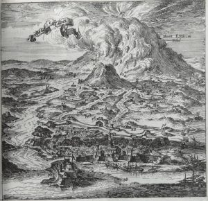 Amsterdam, Chez Jean Jansson, 1674. Petit in-12, veau, dos à nerfs orné (reliure de l’époque). Un titre-frontispice et quatorze planches gravées, certaines repliées (dont une vue de l’Etna et de la ville de Catane). De la bibliothèque du Dresnay, avec ex-libris au timbre humide sur le titre. Coiffe de tête accidentée.