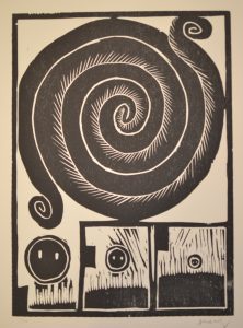 ALECHINSKY (Pierre). "Spirale" (1973). Bois gravé tiré sur vélin d'Arches, just. 11/300 et signé au crayon. Dim. support : 65,5 x 50,5 cm ; sujet : 49,5 x 36 cm (légère mouill. claire au coin infér. gauche).