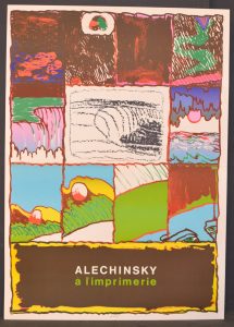 ALECHINSKY (Pierre). Affiche (1975). "Alechinsky à l'imprimerie". Exposition itinérante organisée par le Musée national d'Art moderne et le Centre Georges Pompidou à Paris. Dessin sur acétate insolé sur plaque, imprimé sur presse offset. Au...