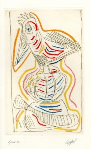 APPEL (Karel). Sans titre [Oiseau]. Pointe sèche en couleurs tirée sur vélin crème, just. "épreuve", signée au crayon et montée sous cadre en bois naturel. Dim. cadre : 56 x 44 cm ; support : 50 x 33 cm ; sujet : 32 x 20,5 cm.