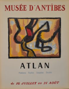 ATLAN (Jean-Michel). Affiche (1957). Lithographie en couleurs tirée sur papier vélin éditée pour son exposition de "peintures, pastels, gouaches et dessins" au Musée d'Antibes. P., Paris-Arts, 1959, dim. : 56 x 44 cm.