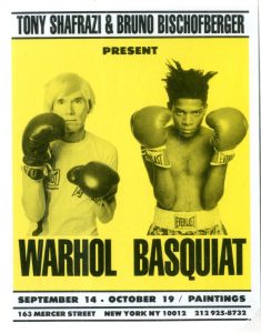 BASQUIAT (Jean-Michel) et WARHOL (Andy). "Warhol Basquiat Paintings" (1985). Feuillet d'annonce publié pour l'exposition de peintures à la galerie Tony Shafrazi à New York du 14 septembre au 19 octobre 1985. Feuillet monté sous passe-partout...