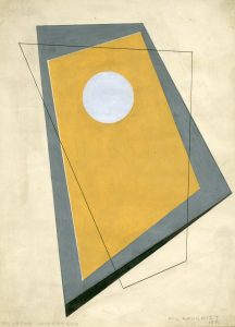 BAUGNIET (Marcel-Louis). "Polyèdre jaune et gris" (1981). Gouache et encre sur papier avec repères à la mine de plomb, titrée, datée, signée au coin infér. droit et montée sous passe-partout et cadre en bois blancs. Dim. cadre : 53,5 x 43,5...