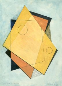 BAUGNIET (Marcel-Louis). "Polyèdre jaune" (1981). Gouache et encre sur papier avec repères à la mine de plomb, titrée, datée, signée au coin infér. droit et montée sous passe-partout et cadre en bois blancs. Dim. cadre : 52,5 x 42,5 cm ;...