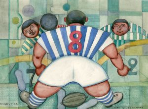 BAUGNIET (Marcel-Louis). "Rugbyman" (1986). Technique mixte sur papier, titrée, datée, signée au coin infér. droit et montée sous passe-partout et cadre en bois blancs. Dim. cadre : 43,5 x 53,5 cm ; sujet : 26,5 x 35,5 cm.