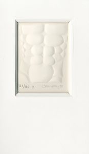 BERROCAL (Miguel Ortiz). "Torso" (1971). Estampe originale gaufrée sur vélin blanc, datée et signée au crayon. Dim. support : 34 x 24 cm ; sujet : 14 x 6,5 cm./ IDEM. "Citius - Altius - Fortius " (1993). Estampe originale gaufrée sur vélin...