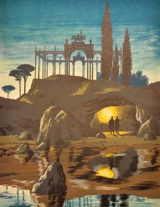 BOGAERT (Gaston). "L'Initiation". Lithographie originale en couleurs tirée sur Japon nacré, titrée, just. 39/50 et signée au crayon. Dim. support : 56,5 x 77 cm ; sujet : 50 x 65 cm (pet. déchirures marg.).