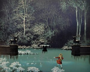 BOGAERT (Gaston). "Le Miroir nocturne". Lithographie en couleurs tirée sur vélin de Rives, just. 15/99 et signée au crayon. Dim. support : 60 x 76,5 cm ; sujet : 45,5 x 56,5 cm.
