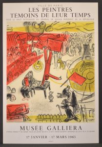 CHAGALL (Marc). Affiche (1963). Lithographie d'interprétation en couleurs pour l'exposition annuelle "Les Peintres témoins de leur temps" au Musée Galliera à Paris. P., Impr. Mourlot, 1963, dim. : 75 x 51 cm (Sorlier, Les Affiches de Marc...