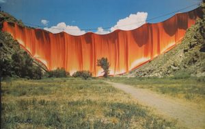 CHRISTO et JEANNE-CLAUDE. "Valley Curtain, Rifle, Colorado, 1970-72" (1973). Planche en quadrichromie tirée sur papier glacé, signée au marqueur bleu par Christo. Photographie de Harry Shunk. Dim. : 63,5 x 99 cm. On joint une seconde planche non...