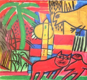 CORNEILLE (C. van Beverloo, dit). Sans titre [Composition au chat rouge]. Lithographie en couleurs tirée sur papier vélin, just. E.A. et signée au crayon. Dim. support et sujet : 45 x 50 cm.